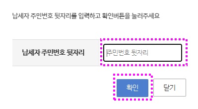 납세자의 주민번호 뒷자리를 입력 후 확인을 누릅니다