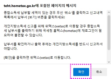 위택스로 이동한다는 안내 창이 활성화됩니다