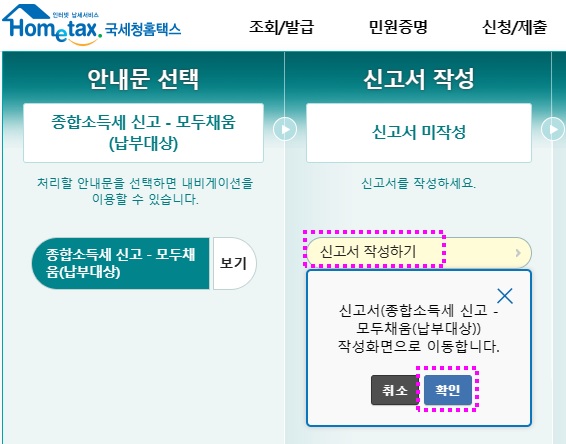 그러면 신고서 작성화면으로 이동한다는 안내 창이 활성화됩니다