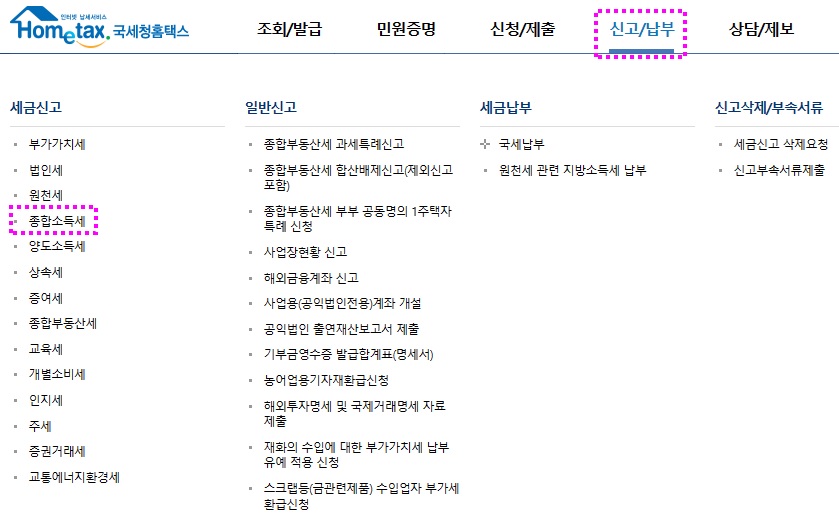 우선 홈택스에서 신고ㆍ납부 → 종합소득세로 이동합니다