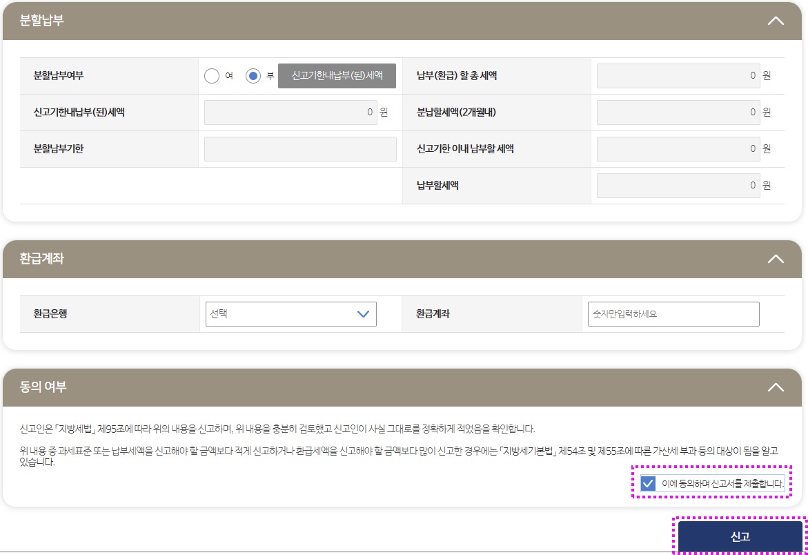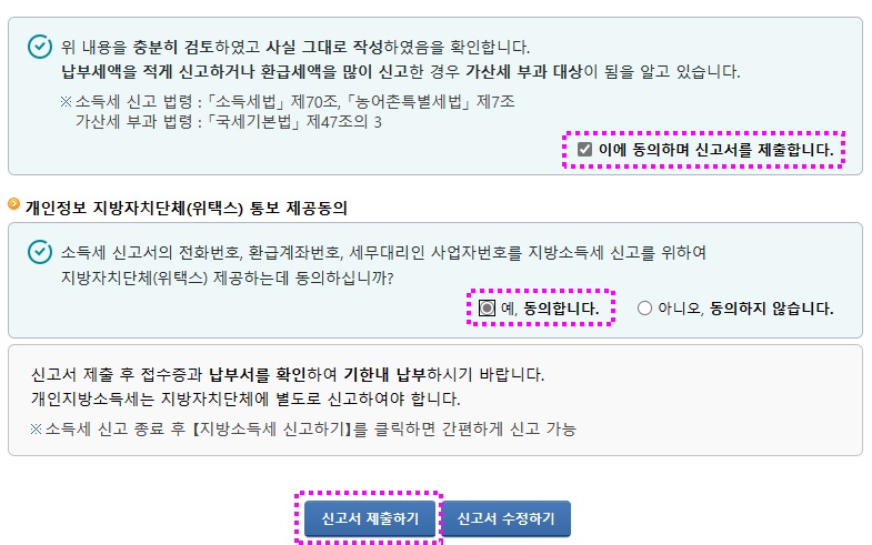 아래 동의 부분을 체크하시고 [신고서 제출하기]를 눌러 주시면 됩니다