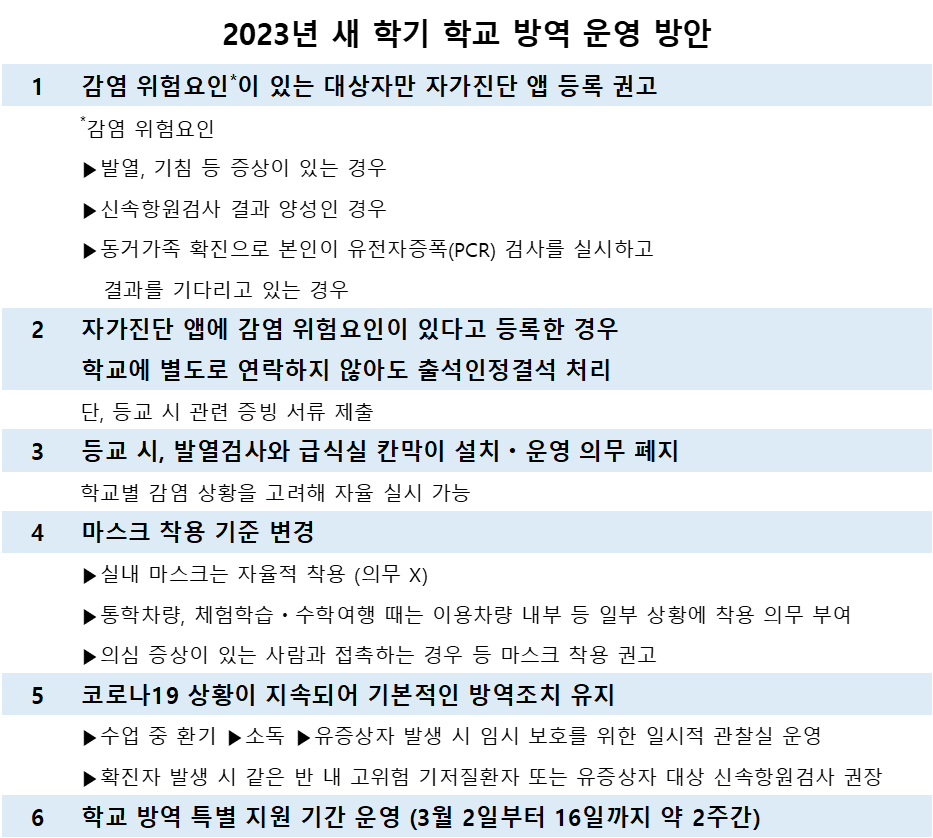 교육부에서 '2023년 새 학기 학교 방역 운영방안'을 발표했습니다.